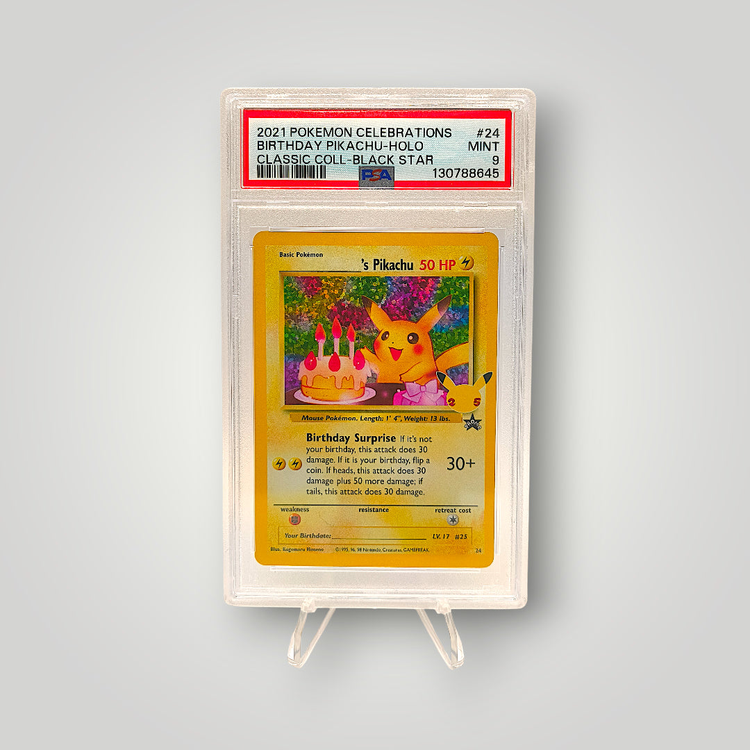 Birthday Pikachu (#24) from the 2021 Pokémon Celebrations – Classic Collection is a holo reprint of the iconic Black Star Promo card, featuring Pikachu celebrating with a birthday cake. This copy has been professionally graded by PSA as Mint 9.