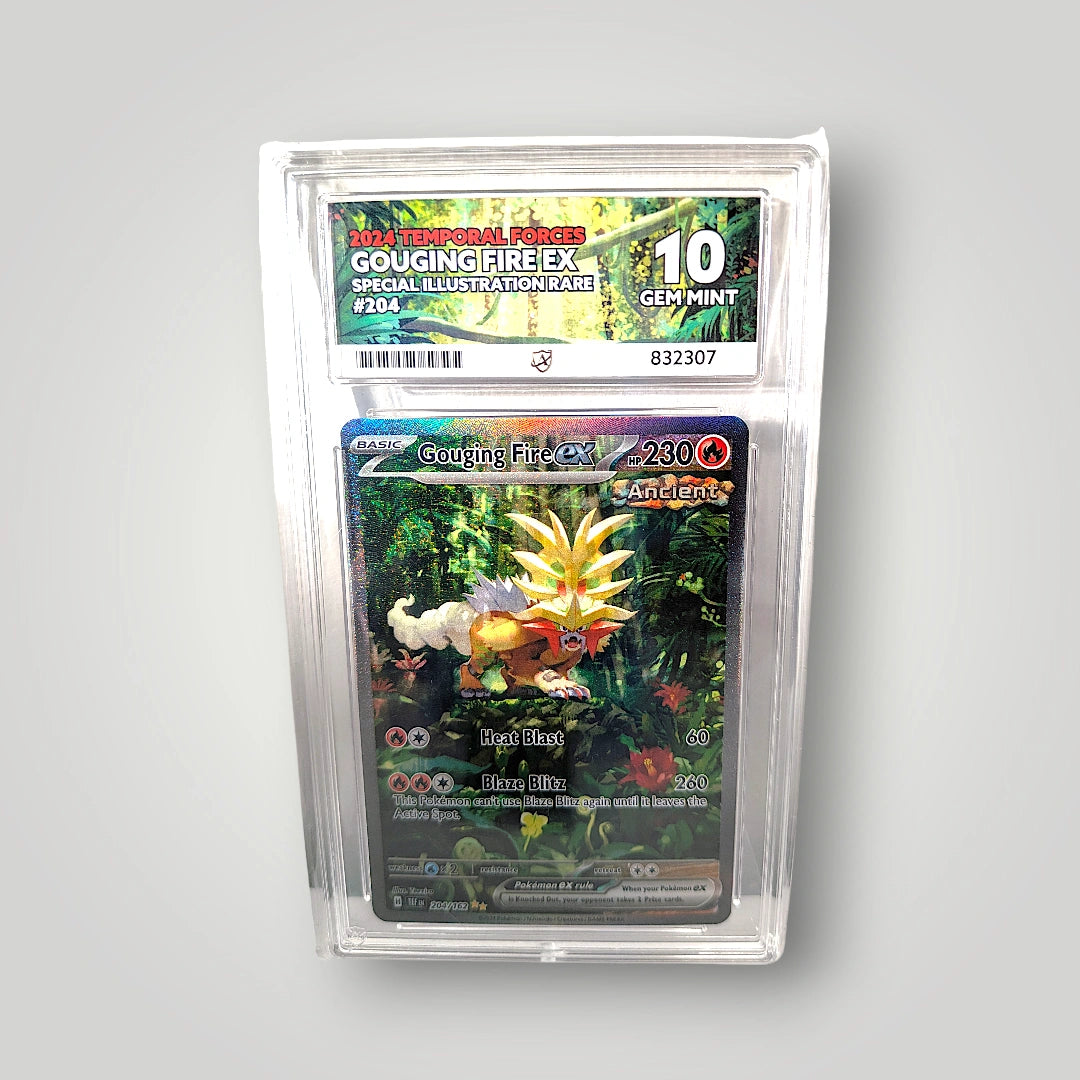 Gouging Fire ex 204/162 (Special Illustration Rare) in an ACE Grading Gem Mint 10 graded slab. This card is from Pokémon TCG: Scarlet & Violet—Temporal Forces (SV05). ACE certification number: 832307.